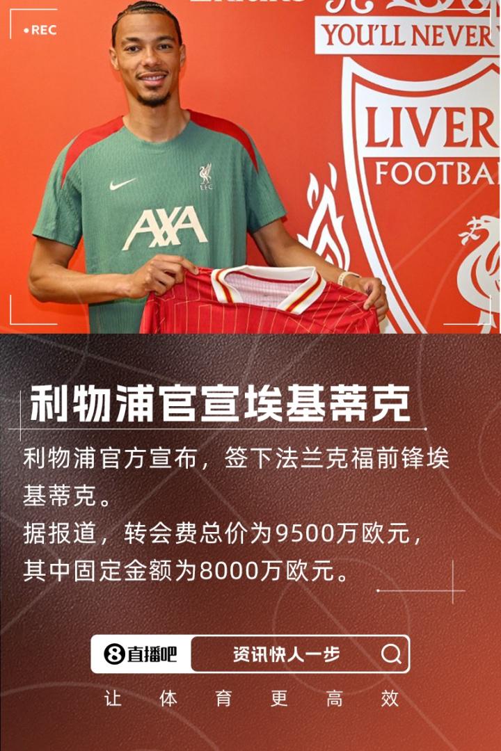埃基蒂克今夏以9500万欧总价从法兰克福加盟利物浦,新赛季开局3场均有进球,贡献3球1助。