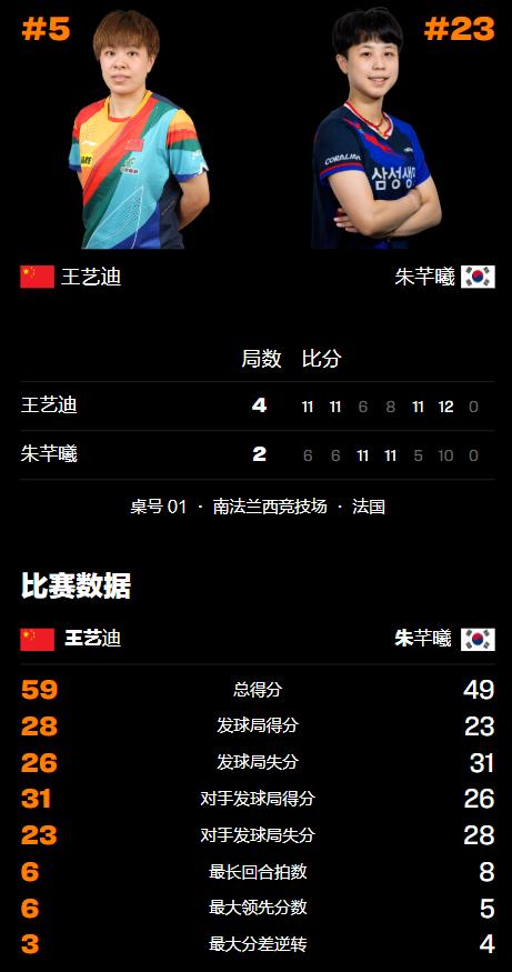 王艺迪:3-1早田希娜(日本)、3-2高桥布鲁娜(巴西)、4-3张本美和(日本)。