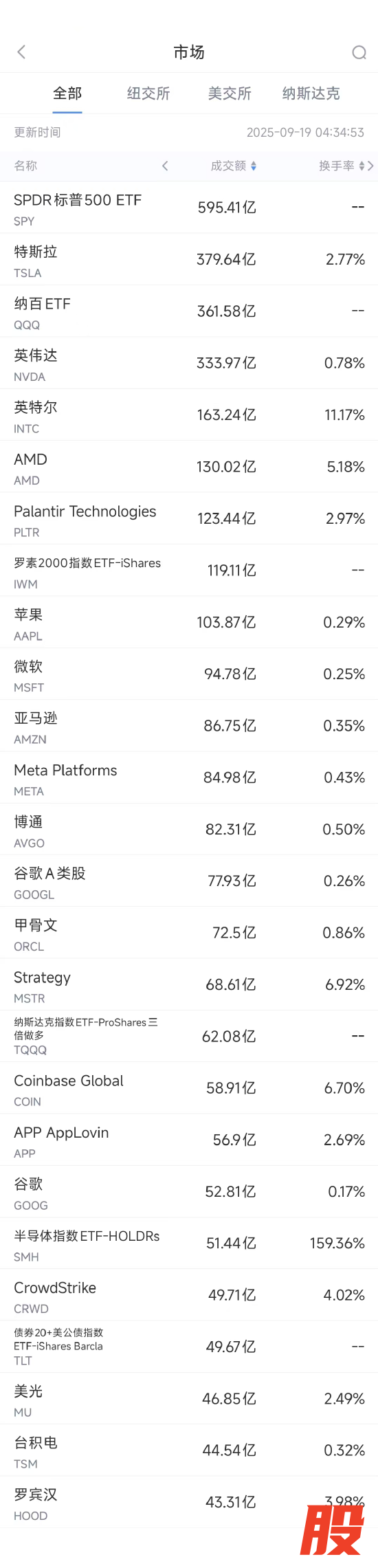 第2名英伟达收高3.49%,成交333.97亿美元。Gordon Haskett机构表示:“看到英伟达向英特尔投资50亿美元的新闻,我们的第一反应是50亿美元对英伟达微不足道,这笔小额投资却能巩固其在特朗普政府的地位。毕竟在英伟达产品在重要市场遭到禁售之际,该公司正需要政治层面的支持。”
